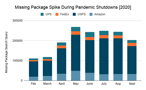 These four carriers make up the majority of delivery services nationwide. Between them, the rate of missing packages rose 128% in response to consumer behavior triggered by COVID.